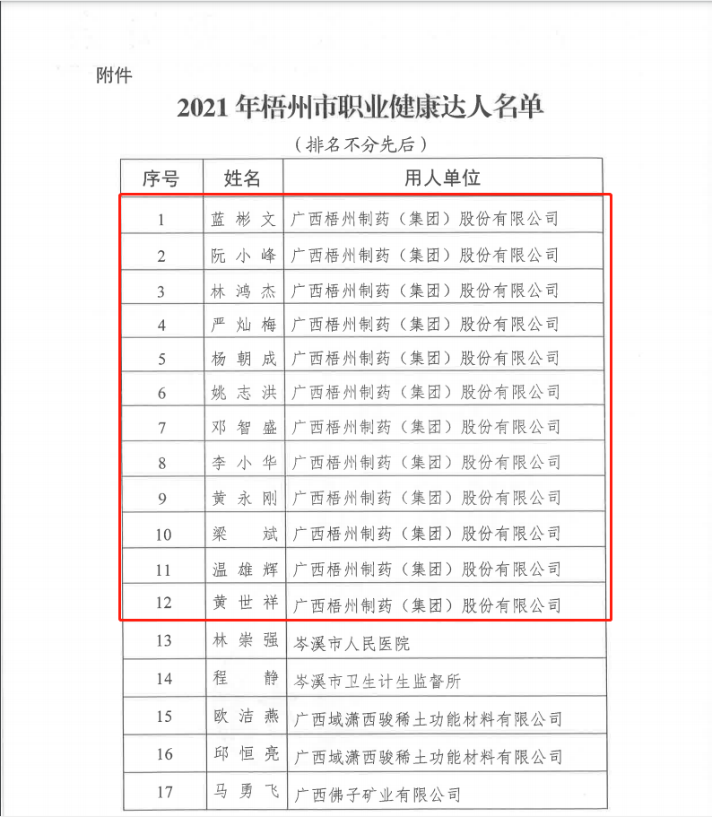近日,梧州市衛(wèi)生健康委公布2021年度梧州市職業(yè)健康達(dá)人評(píng)選結(jié)果,梧州制藥12名職工獲得“職業(yè)健康達(dá)人”稱號(hào)。