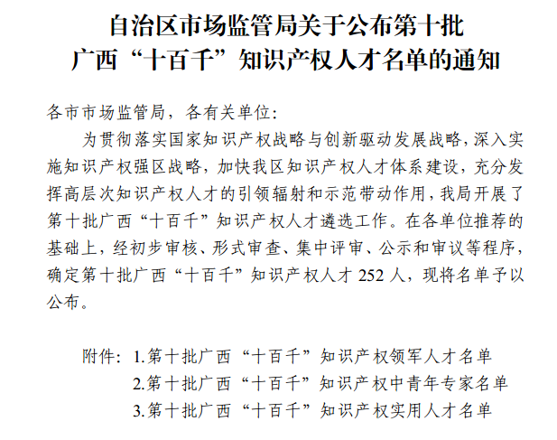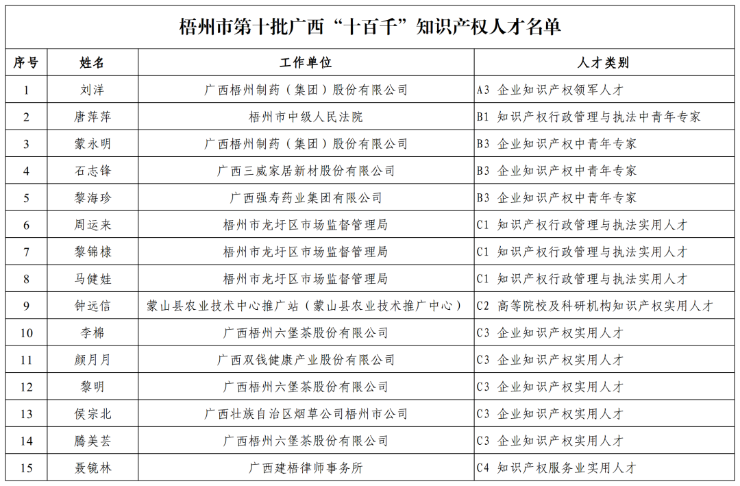 此次入選第十批廣西“十百千”知識產(chǎn)權(quán)人才名單,不僅是對兩名同志在知識產(chǎn)權(quán)領(lǐng)域所取得成績的肯定,更是對梧州制藥近年來深入貫徹廣西知識產(chǎn)權(quán)“十百千”人才工程建設(shè)要求,積極打造高素質(zhì)專業(yè)化的知識產(chǎn)權(quán)人才隊(duì)伍的認(rèn)可和鼓勵(lì)。