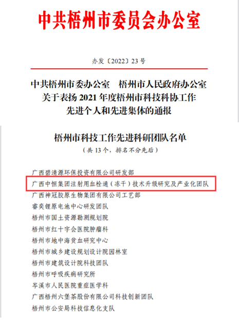 近日,中共梧州市委辦公室、梧州市人民政府辦公室發(fā)布《關(guān)于表揚 2021年度梧州市科技科協(xié)工作先進個人和先進集體的通報》,“注射用血栓通(凍干)技術(shù)升級研究及產(chǎn)業(yè)化團隊”榮獲“梧州市科技工作先進科研團隊”稱號。